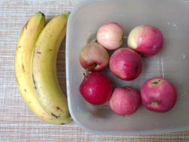 Помойте яблоки, разрежьте их на четвертинки и удалите сердцевины. Очистите бананы и нарежьте их кружочками. Используя блендер, сделайте из яблок и бананов однородное пюре.