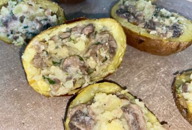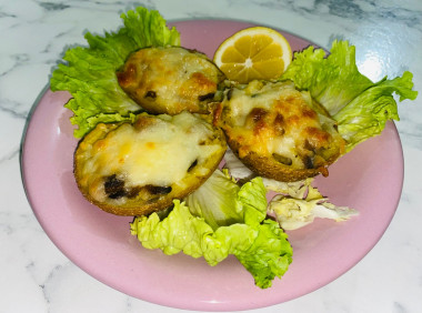 Картофель фаршированный грибами изумительный, очень вкусно. Грибочки с картофелем в мундире идеально сочетаются. Подала с листьями салата, также будет вкусно с другими свежими овощами.