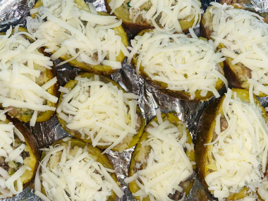 9. Немного картофельной мякоти добавляем к грибам, перемешиваем. Начиняем грибами картофельные горшочки, сверху посыпаем тертым сыром.