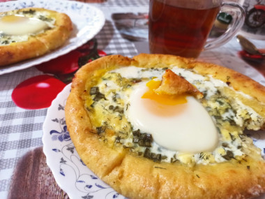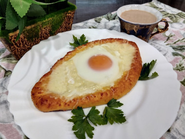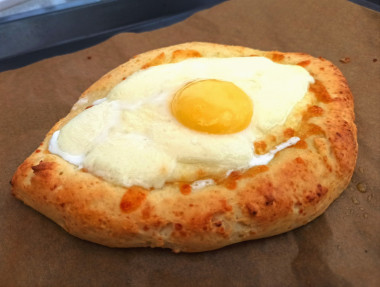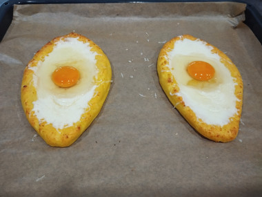 Снова поставьте противень с хачапури в духовку. Дождитесь, когда побелеет белок. Желток должен лишь схватиться сверху. Достаньте хачапури из духовки и сразу подавайте к столу. Едят хачапури, отламывая кусочек теста с сыром и макая его в растекшийся желток. Приятного аппетита!