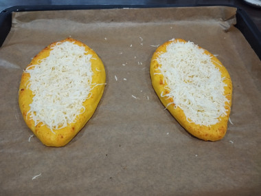 Тесто должно запечься до золотистого цвета. Моему понадобилось около 25 минут. Так что ориентируйтесь лучше на внешний вид. Достаньте противень с основой из духовки, духовку не выключайте. Насыпьте в середину лодочки натертый сыр. Верните противень в духовку.