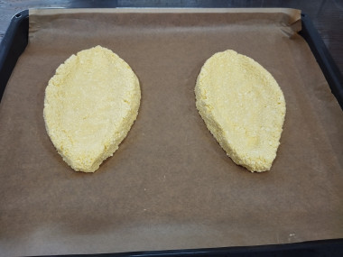 Возьмите противень, застелите его пергаментом. Правильно выбрать пергаментную бумагу вы сможете, прочитав отдельную статью про особенности пергамента, ссылка есть в конце рецепта. Выложите на пергамент тесто. Сформируйте из него лодочку с бортиками. Удобнее это делать мокрыми руками. Поставьте в разогретую духовку противень с лодочкой на 10-15 минут. Точное время зависит от вашей духовки. Подробнее об этом в отдельной статье, ссылка в конце рецепта.