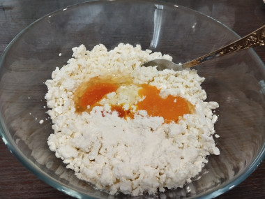 Перемешайте все ингредиенты вилкой. Должно получиться довольно густое тесто. У меня был очень жидкий творог и большое яйцо, мое тесто вышло жидковатое. Его было тяжелее формировать, оно пеклось дольше по времени, немного расплылось, но все равно получилось очень вкусным.