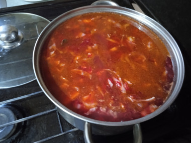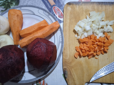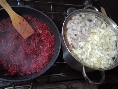 Сделайте зажарку, сперва обжарив на растительном масле свеклу, а затем поочередно добавив морковь, лук и болгарский перец.
