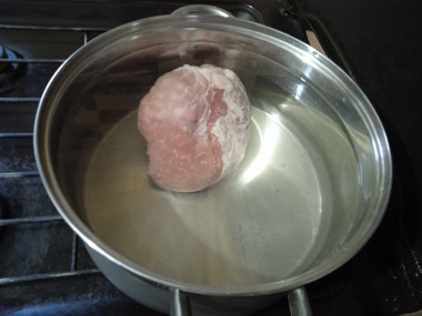 Свинину хорошо промойте, залейте холодной водой и поставьте вариться вместе с лавровым листом и специями на плиту до готовности (примерно час), периодически снимайте образовавшуюся пену с бульона.