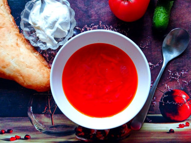 Приготовила на обед борщ классический со свининой по этому рецепту. Сначала поставила вариться кусок мяса и занялась овощами. Чистила, мыла и нарезала. Затем варилась картошка с капустой и мясом. А я тем временем приготовила тушёные овощи с томатной пастой на сковороде. Единственное, что не клала это болгарский перец за неимением оного. После добавила овощи в кастрюлю. Борщ сразу приобрел очень красивый цвет и волшебный аромат. Сварила классический борщ до готовности. Это очень просто и совсем несложно. Ароматный и насыщенный борщ подавала со сметаной, черным хлебом, салом с чесноком и зелёным луком. Очень вкусное первое блюдо. Свинина нежная, овощи мягкие, капуста не хрустит. Обалденный вкус привнесла зажарка из овощей с добавлением томатов, чеснока и томатной пасты. Борщ по этому рецепту вышел отменный. Кушали всей семьёй. Он яркий, сытный, аппетитный и ароматный. Великолепный рецепт! Благодарю автора 😊