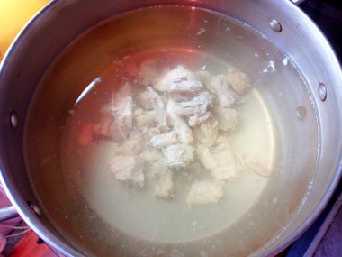 Бульон сварила на косточках, отрезанных от свиных кореек. Готовый бульон процедила через чистую хлопчатобумажную ткань. Мясо отделила от косточек и нарезала на небольшие кусочки. Заправку я добавила готовую, замороженную ещё с начала осени.
