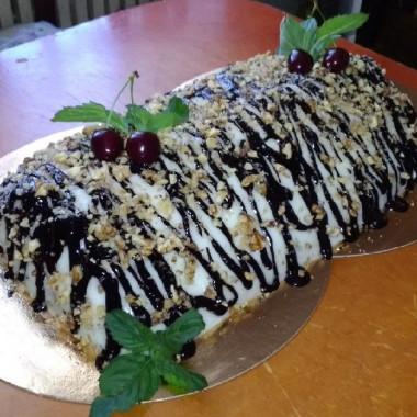 Мои изменения в рецепте: использовала не мороженную, а свежую вишню (удалив косточки), и сверху посыпала готовый торт тертым грецким орехом. В остальном всё согласно описанию в шагах.