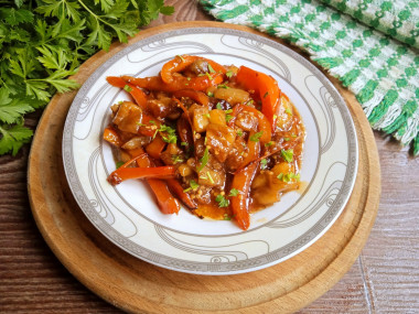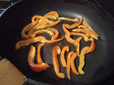 Сладкий перец нарежьте соломкой. Обжарьте его в сковороде с разогретым подсолнечным маслом, постоянно помешивая и следя, чтобы не пережарились. Как только начнет появляться корочка, снимайте с огня.