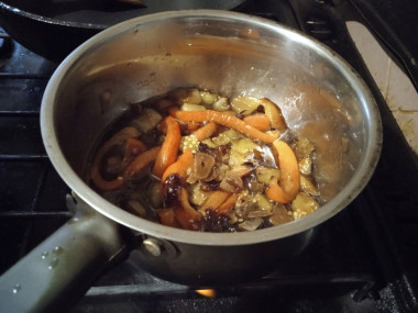 Сложите обжаренный перец в отдельный сотейник (у меня он из закаленного стекла).