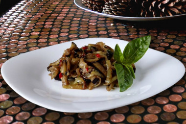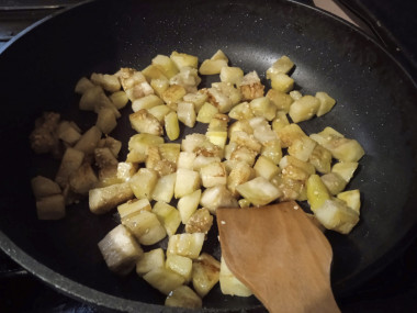 Пожарьте баклажаны на той же сковороде с маслом до изменения цвета. Они должны стать мягкими. Помешивайте при жарке. Потом добавьте жареные баклажаны к перцу.