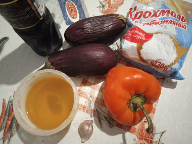 На той же сковороде, где жарился перец и баклажаны, из оставшихся ингредиентов приготовьте соус: сначала обжарьте нарезанный лепестками чеснок, добавьте имбирь, соевый соус, мед, крахмал. Перемешайте. В конце все разведите водой и прокипятите минуты 2.