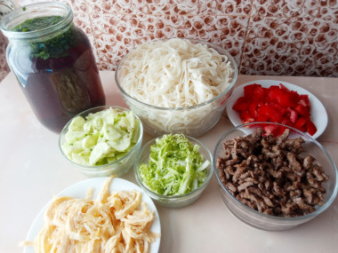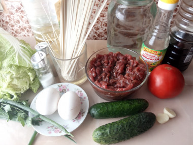 Как сделать кукси по-корейски с мясом? Подготовьте необходимые продукты. Лапшу можно брать любую: яичную, рисовую, гречишную. Про тонкости выбора лапши читайте в статье в конце этого рецепта. Я использовала пшеничную. Основой овощных составляющих всегда будет огурец и зелень, остальные могут меняться по наличию, вариантов много.