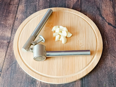 Чеснок очистите от шелухи, промойте водой и мелко нарубите ножом или же измельчите под прессом.