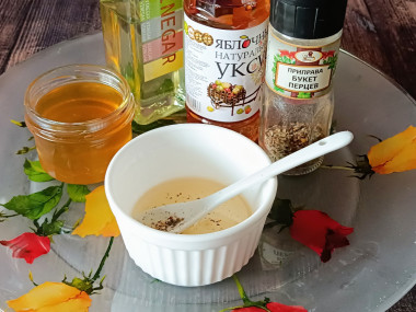 Пока готовлю соус к салату. Смешиваю 2 ст. ложки масла растительного, 1 ст. ложку яблочного уксуса и 1 ч. ложку мёда. Добавляю к кабачками и ещё на 20 минут в холодильник.