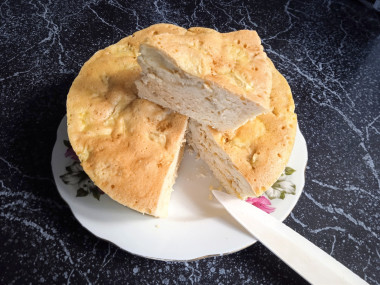 Извлеките шарлотку из чаши и снимите с него пленку. Если вас смущает белый цвет пирога, то можно его полить шоколадом. Но, на мой взгляд, шоколад будет перебивать вкус яблок. Поэтому я посыпала сахарной пудрой. Сам пирог получается нежнее и влажнее, чем из духовки. Нам очень нравится! Угощайтесь и вы!