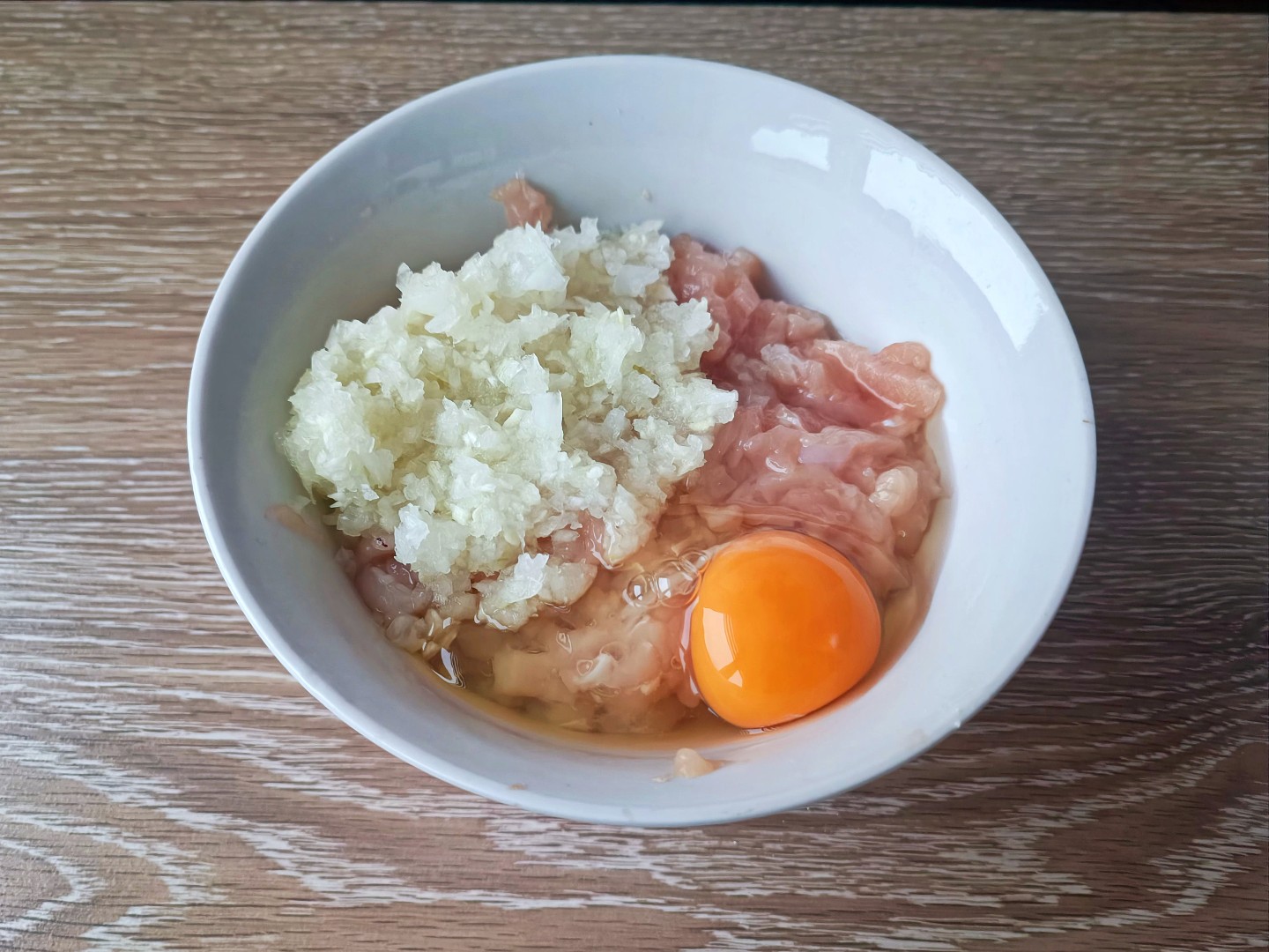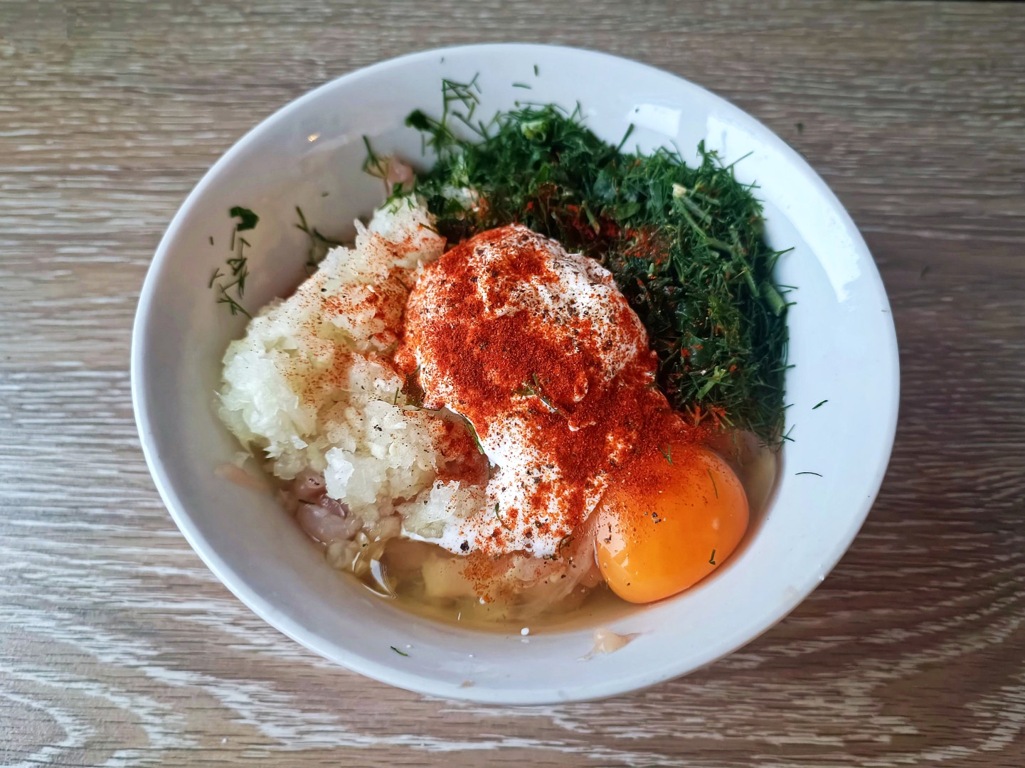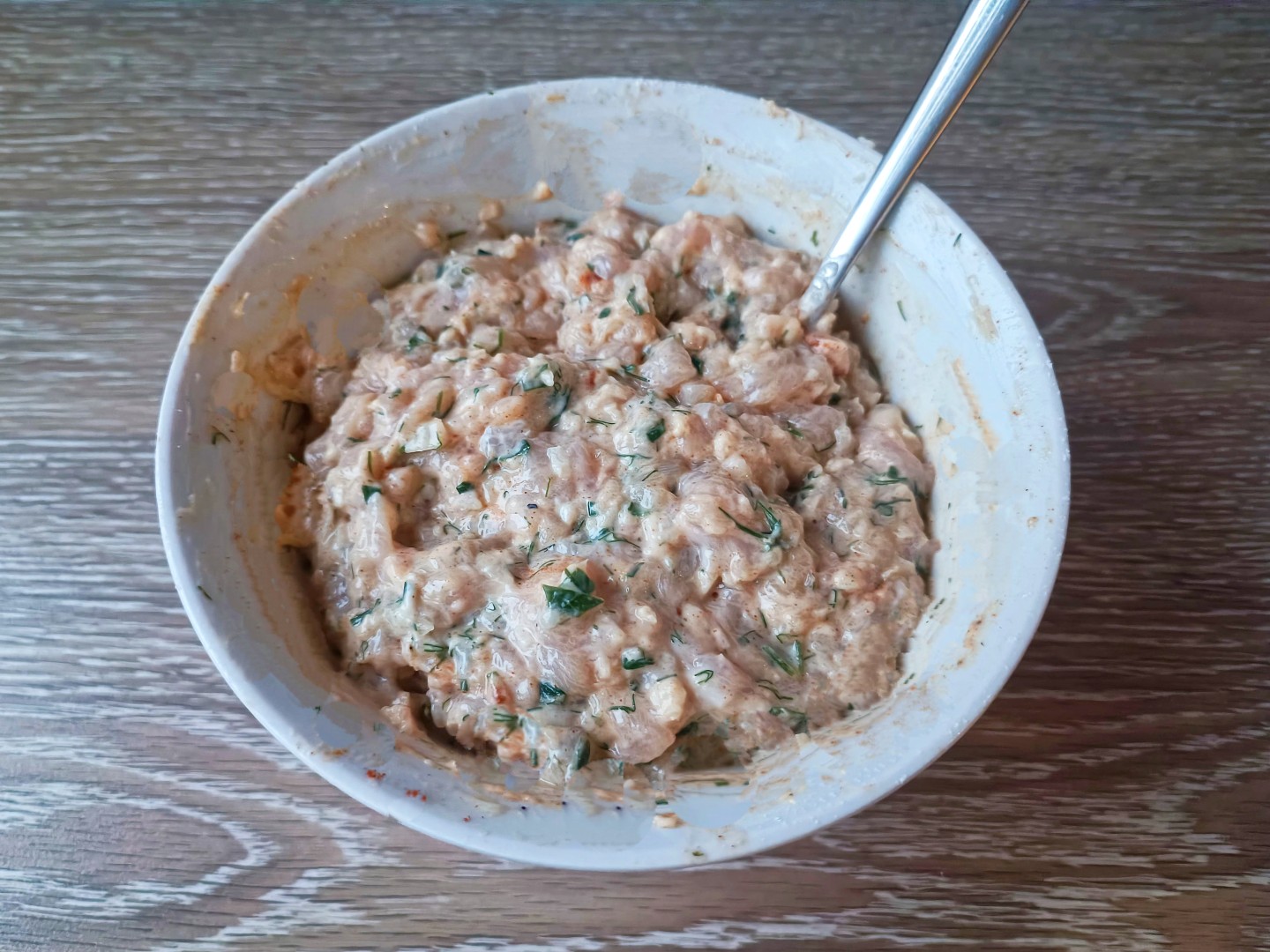 Самое долгое — нарезать курицу мелкими кубиками, но в этом и суть). Лук и чеснок я измельчила в блендере. Все ингредиенты смешала в миске, муки добавила на пару ложек больше для плотности.