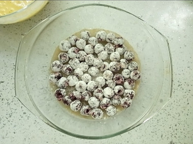Вишни хорошо обваляла в крахмале и выложила в форму, дно которой застелила пергаментом. Сверху распределила тесто и выпекала 35 минут при 180°С, затем еще 15 минут при 170°С.