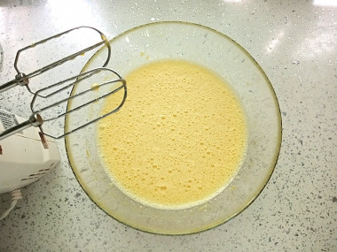 Яйца взбейте миксером до пышной светлой пены, постепенно подсыпая сахар и ванильный сахар. Масса должна увеличиться в объеме в 3-4 раза и посветлеть.
