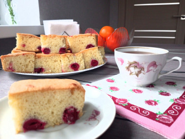 Шарлотка получилась пышной, пористой и легкой! Вишня не потекла и не отслоилась от теста. Пирог хорошо нарезается кусочками. Вкус приятный, сладкий и легкой кислинкой!