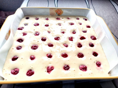 В застеленную пергаментом форму для запекания (Ø 18 см) выложите вишню в крахмале. Пергамент выбирайте качественный, лучше силиконизированный. Подробнее о различных видах пергамента читайте в конце рецепта. Сверху залейте ягоды бисквитным тестом. Можете просто вмешать ягоды в тесто и вылить все в форму.