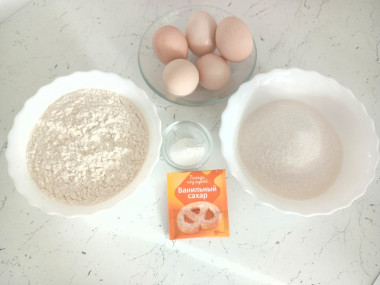 На 5 яиц я беру по 200 граммов сахара и муки.