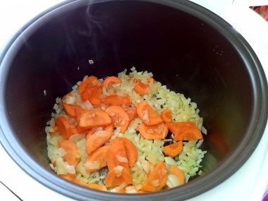 Включите мультиварку на режим "Жарка" и разогрейте чашу до горячего состояния. Налейте в неё немного растительного масла. Выложите нарезанный лук и обжарьте в течение минуты до прозрачности. Очищенную морковь нарежьте полукольцами или брусочками. Можно натереть на терке. Добавьте в чашу морковь. Обжаривайте овощи еще 3-4 минуты.