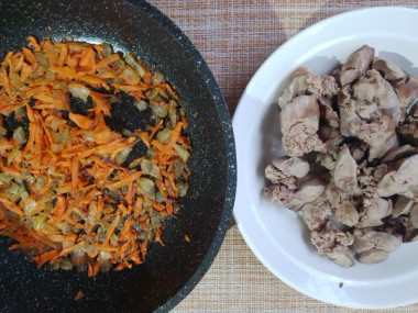 Готовую печенку переложите на тарелку и охладите. Нарежьте средними кусочками. Немного бульона оставьте. При желании можно измельчить печенку с помощью блендера сразу, пока она горячая, налив немного бульона. А потом, добавив овощи и сливочное масло, взбить всё вместе ещё раз (шаг 7).