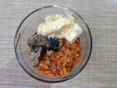 В чашу блендера выложите говяжью печенку, оставшееся сливочное масло комнатной температуры, обжаренные морковь и лук.