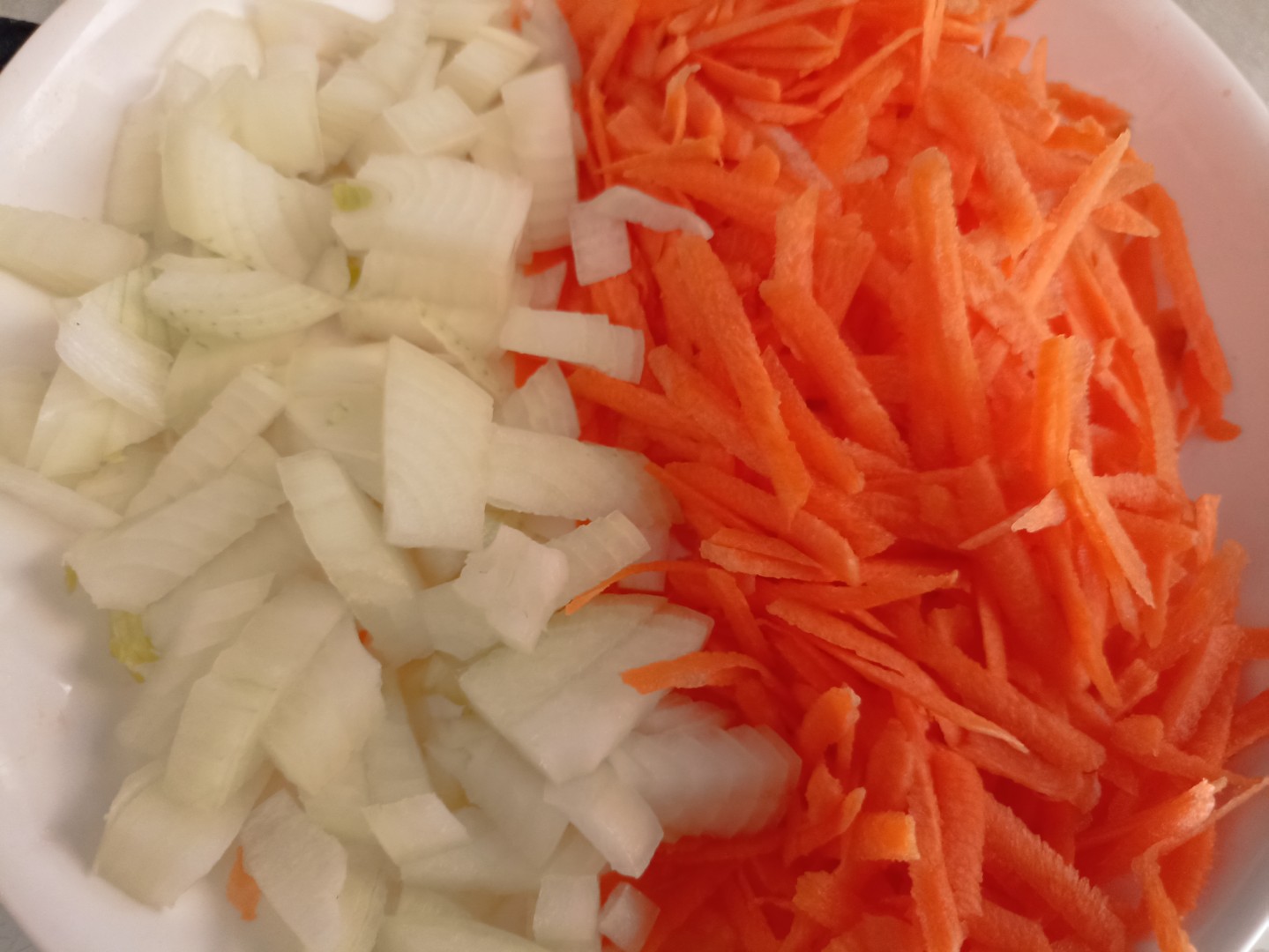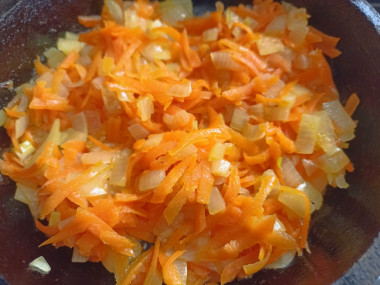 В сковороде на небольшом огне разогрейте 20 г сливочного (или топленого) масла. Выложите морковь и лук и обжарьте, помешивая, до золотистого цвета 5-7 минут. Влейте в сковороду 2-3 ст. л. бульона, все посолите, поперчите и тушите, помешивая, 5 минут. Уберите сковороду с огня, овощи охладите.Шаг 7: