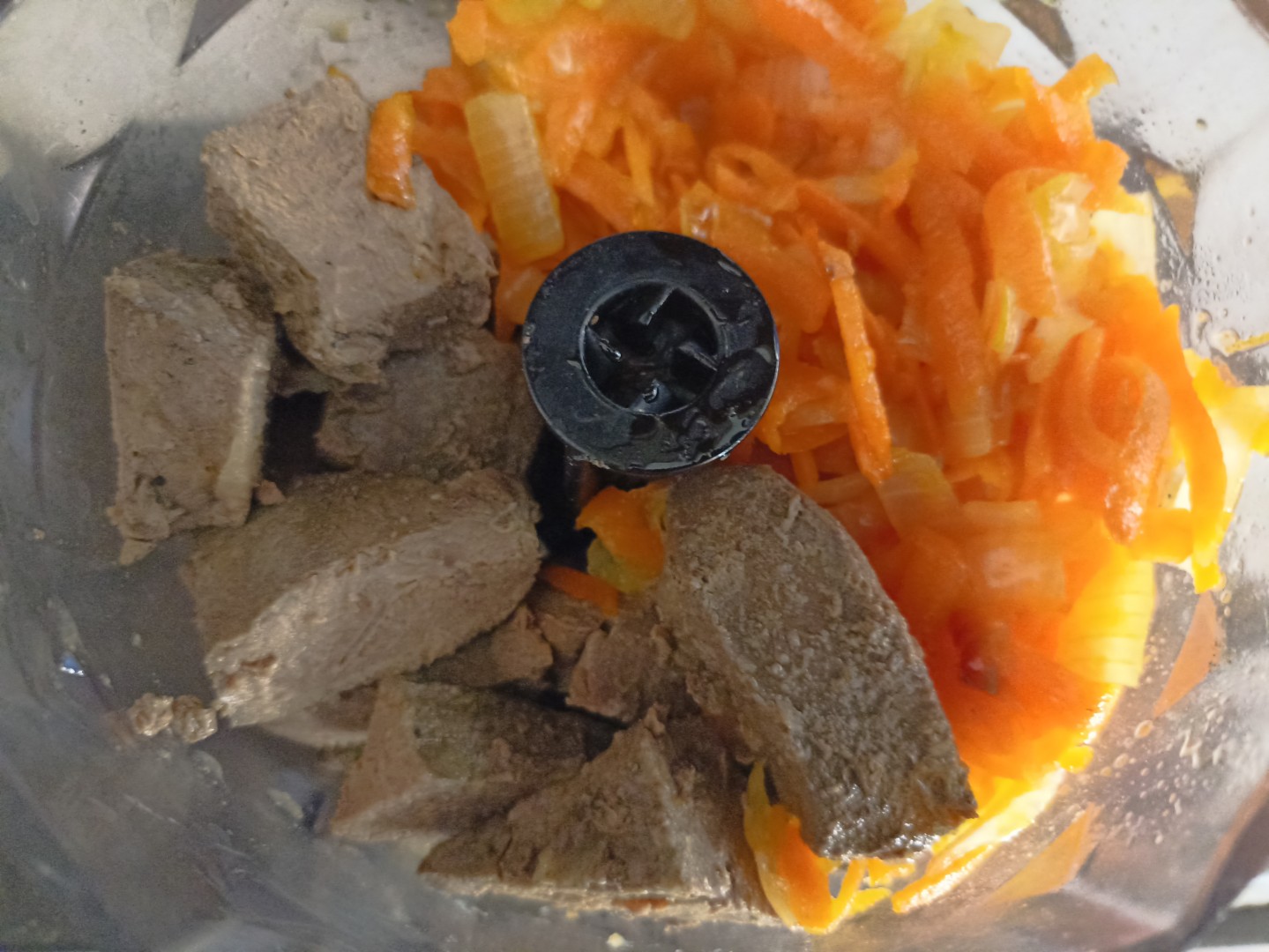 В чашу блендера выложите говяжью печенку, оставшееся сливочное масло комнатной температуры, обжаренные морковь и лук.Шаг 8:
