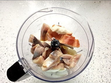 Я не любитель разделывать селедку, поэтому купила готовую. Кусочки были в масле, поэтому дополнительно растительное масло не добавляла. С селедки лишнее масло слила, его оказалось достаточно для форшмака.