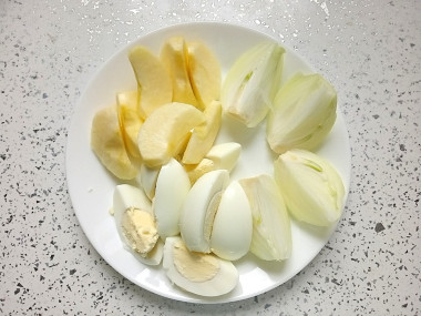 Яйца вымойте теплой водой и отварите вкрутую в течение 10 минут. После чего залейте холодной водой, остудите и очистите от скорлупы. О выборе яиц и том, как сварить их правильно, читайте по ссылке в конце рецепта.