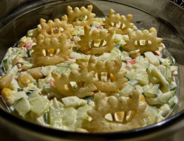 Вместо палочек использовали цельное крабовое мясо - вышло мягче, чем с обычно получалось с палочками. Украсили крабовыми чипсами. Салат получился нежнейший, кушать его одно удовольствие. Супер