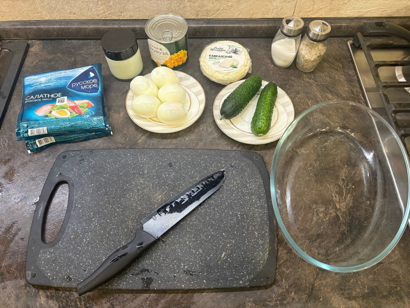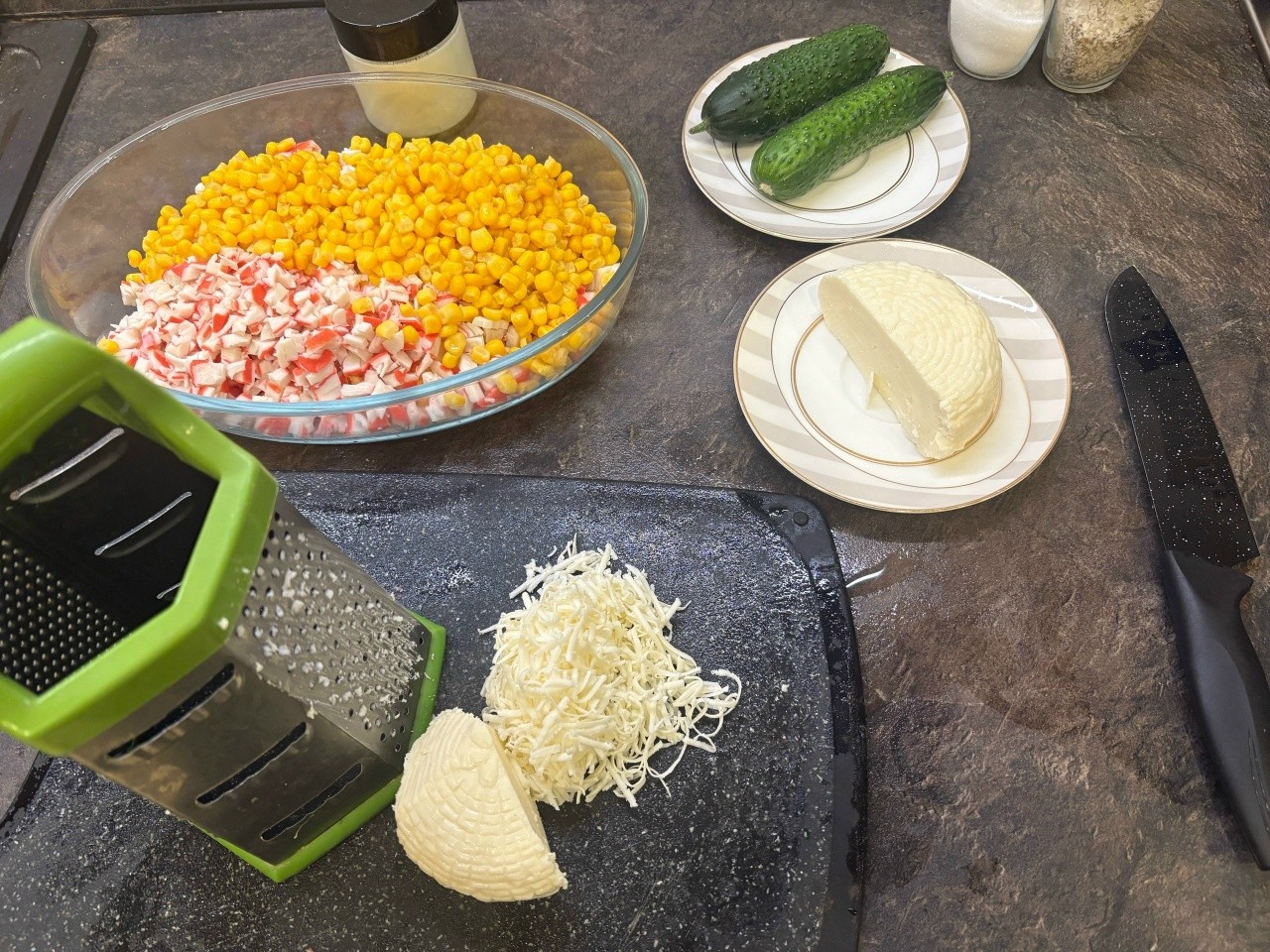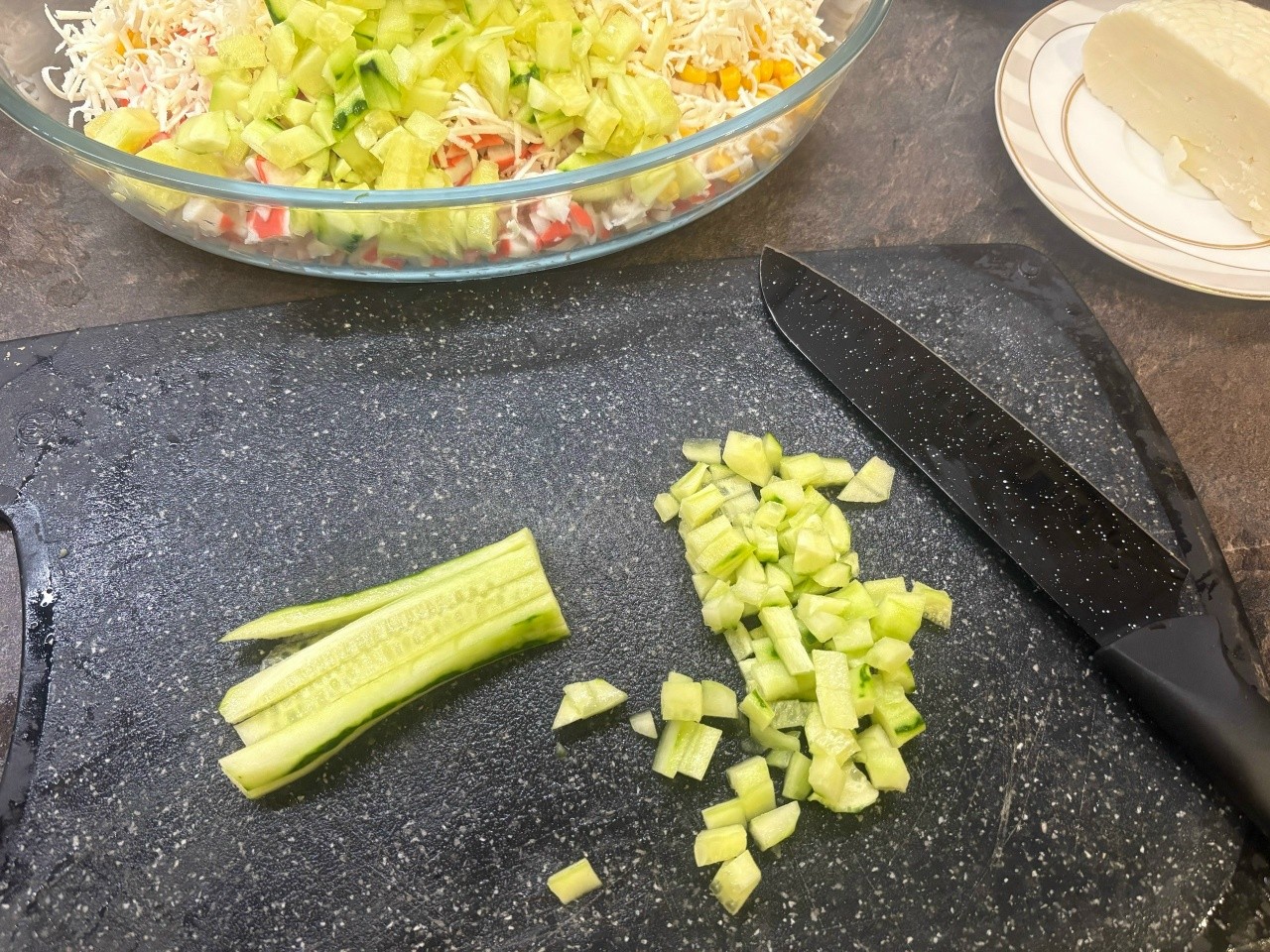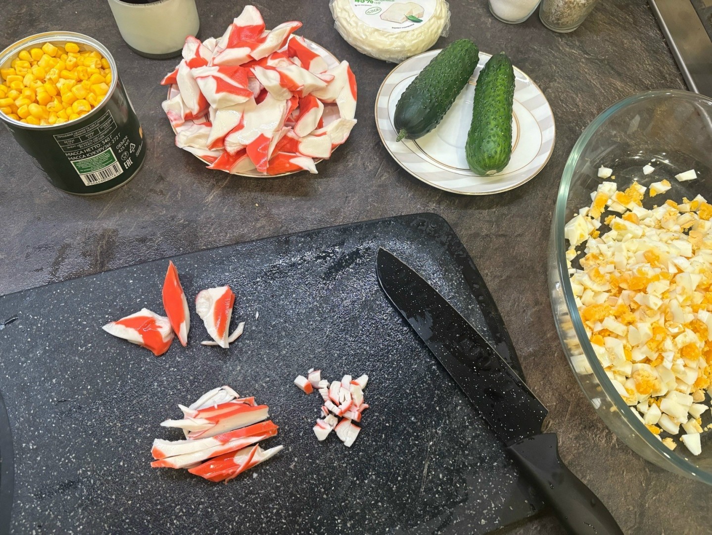 Когда собираемся всей нашей большой родней на праздник, то самый любимый салат, это конечно "Крабовый". Его любят и дети и взрослые. Повод для праздника был грандиозный, пятый племянник родился) Я взяла на себя часть блюд для стола. Самое главное, приготовить этот вкусный салат! Нам очень нравится такой состав, особенно с добавлением свежего огурца. В те времена, когда этот салат только появился на столах, в его состав входили только крабовые палочки, яйца и кукуруза. А потом стали появляться вариации. Мне кажется с огурцом самый классный вариант. Он придает сочности, свежести и салат уже не кажется слишком скучным. И внешний вид тоже значительно выигрывает, яркие цвета всегда привлекают внимание. Крабовые палочки для салата всегда беру охлажденные, они сочнее и вкуснее. К тому же сразу видно качество продукта. Майонез добавила на лимонном соке, мне такой больше нравится. Яиц взяла побольше, чтобы увеличить объем. Салат получился прекрасный, вкусный, ароматный, сочный. Иногда добавляю в этот салат укроп, он тоже придает пикантную нотку)