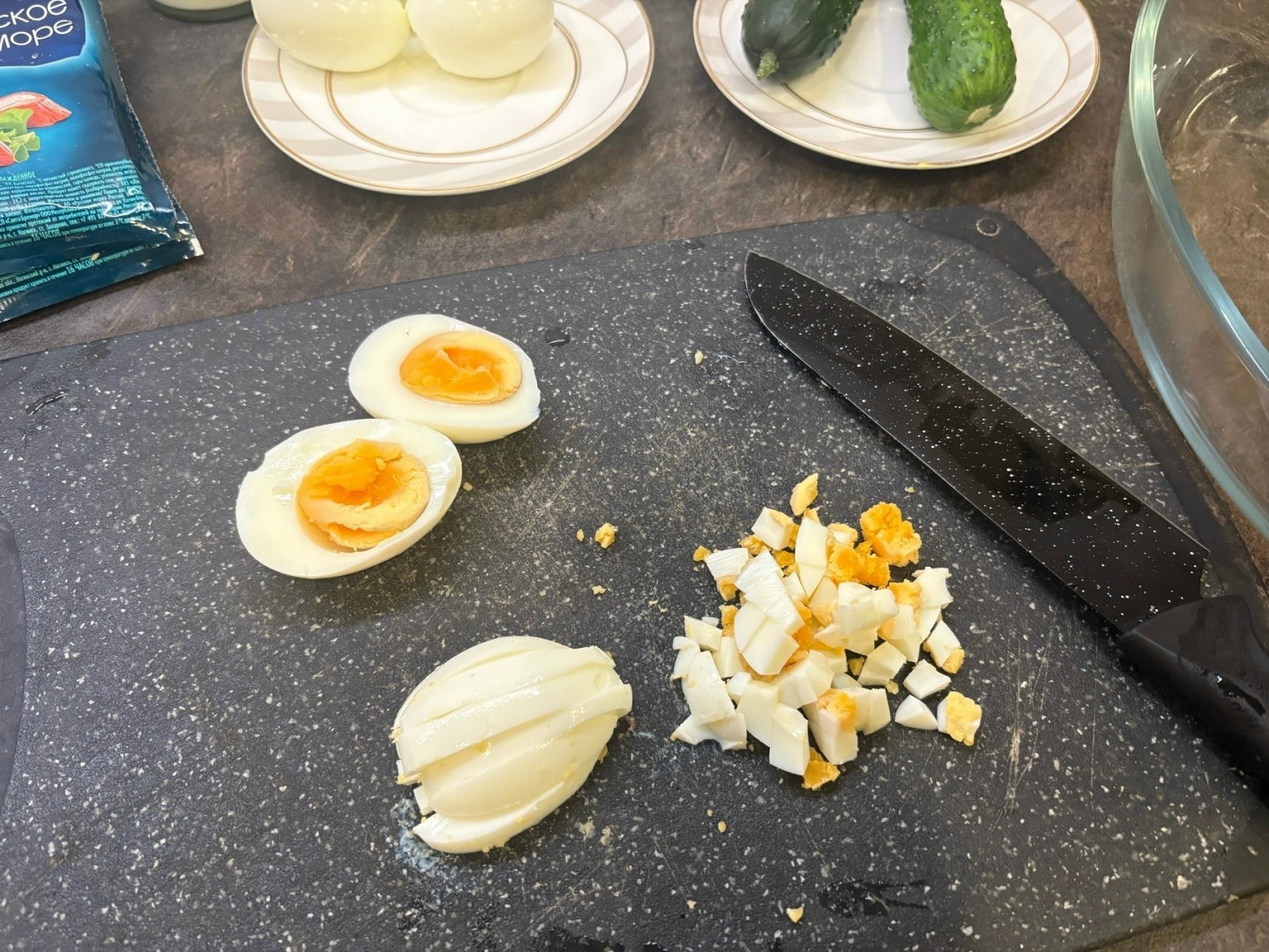 Яйца отварите вкрутую. Обычно это около 8 минут после закипания воды. Сразу залейте приготовленные яйца холодной водой, это поможет их побыстрее очистить. Очистите яйца и нарежьте их мелким кубиком.