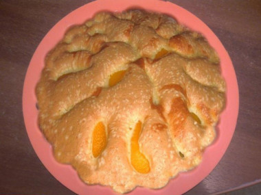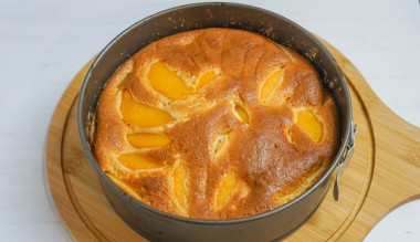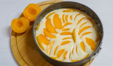 Сверху теста разложите дольки персиков по своему желанию. Или просто перемешайте персики с тестом, а затем перелейте в форму.