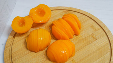 Подготовленные персики разрежьте на дольки или кусочки, оставив одну половинку для украшения. Включите духовку разогреваться до температуры 180 градусов.