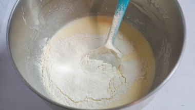 Соедините муку с разрыхлителем и просейте в миску с массой, аккуратно перемешайте до однородного теста. Обязательно просеивайте муку, это насытит ее кислородом и сделает выпечку более воздушной и нежной. Пшеничную муку можно заменить на более полезные сорта, а как это сделать и свойствах разных сортов можно узнать в статьях под шагами ниже.