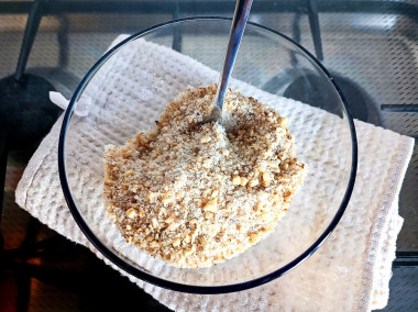 В миске смешала - грецкие орехи (слегка измельчённые в блендере), панировочные сухари, сахар и щепотку ванилина.