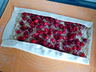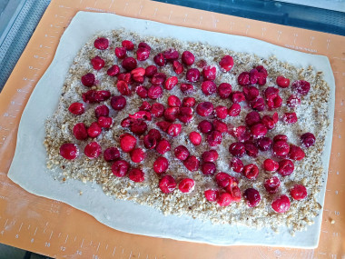 Отступив от края по паре сантиметров, равномерно насыпьте на тесто половину сухой смеси, а затем слой вишни. У меня было два пласта теста, начинку разделите по количеству пластин. Затем подверните края противоположных сторон и аккуратно сверните рулет, стараясь не оставлять воздух. Защипните шов и перенесите рулет на противень, застеленный бумагой для выпечки, швом вниз. Аналогично приготовьте второй рулет.