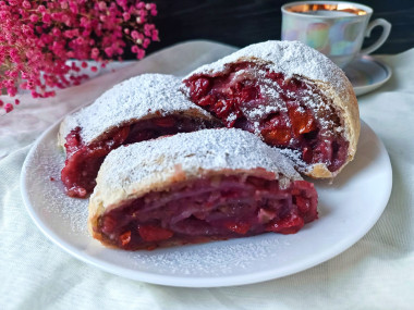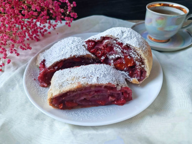 Безумно вкусный штрудель с вишней из слоёного теста! Готовлю уже второй раз — муж в восторге, постоянно просит добавки. Главный плюс рецепта: не нужно возиться с тестом. Готовится быстро, а результат просто восхитительный!