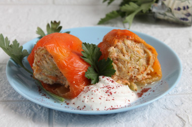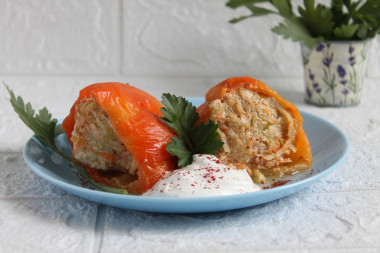 . Перец у меня был замороженный, кабачок и морковь измельчила в комбайне, яйца в начинку не добавляла. Тушила их в мультиварке, залив сметаной, смешанной с домашним кетчупом и водой. Подавала с йогуртом. Спасибо