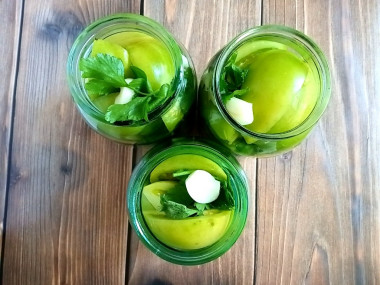 Наконец-то я дождалась, когда в продаже появятся зеленые помидоры. Сразу заготовила соленые зеленые помидоры на зиму в банках. У меня были литровые баночки, а помидоры оказались очень большими, входило только 2-3 штуки. Поэтому решила разрезать их на 4 части, таким образом в банках уместилось много помидоров.