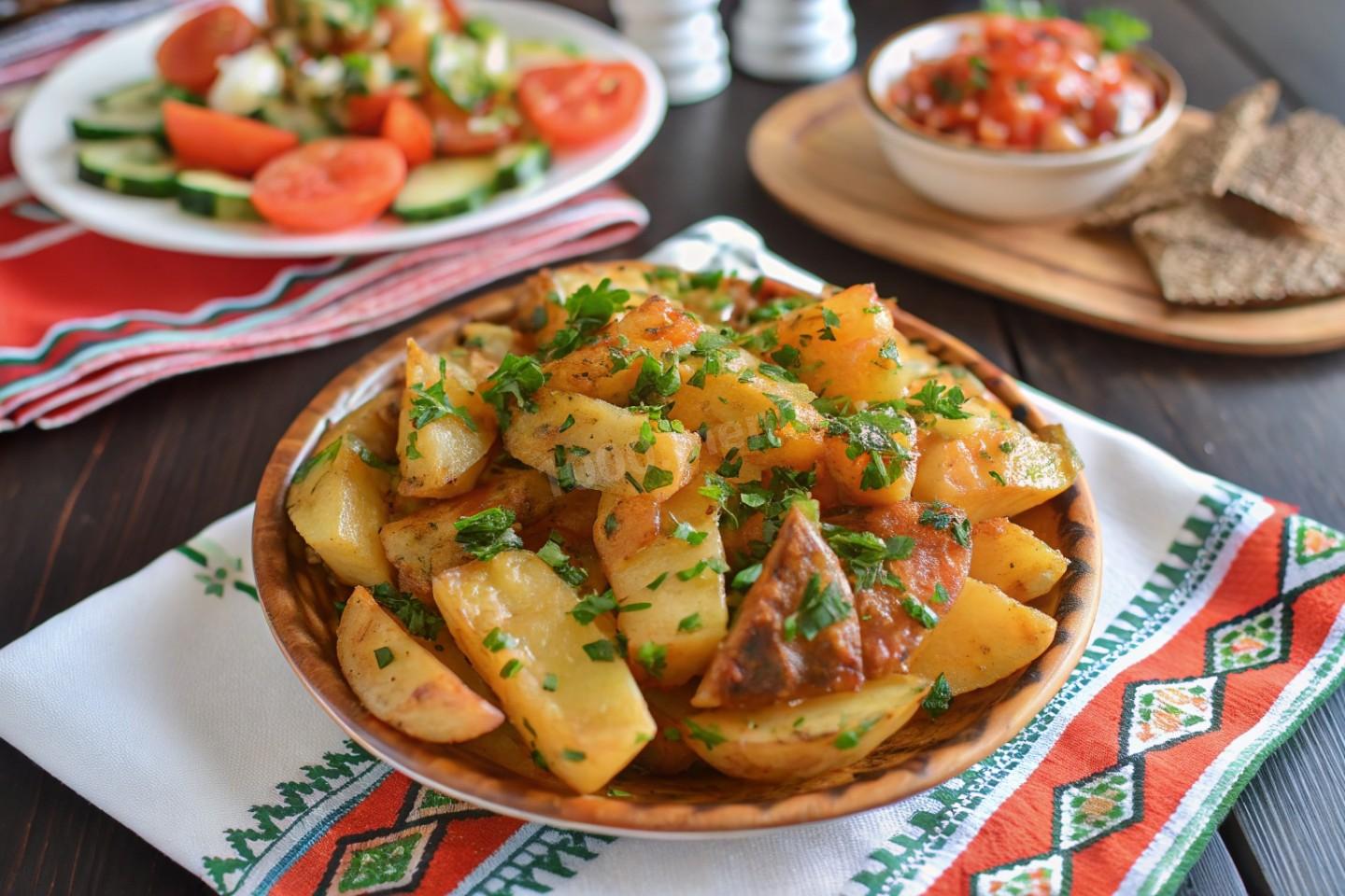 Горячую картошку по-деревенски раскладываем по тарелкам, посыпаем измельченным укропом и подаем на стол.