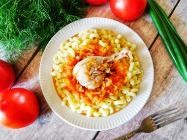 Лук и морковь, обжаренные на растительном масле я очень люблю. Соединив их с мясом, получила очень аппетитное и вкусное блюдо! Тушеная курочка стала мягкая, сочная. Соус получился наваристый и приятный на вкус. Ели курицу с макаронами и свежими овощами.