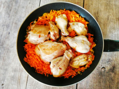 Для готовки взяла сковородку, отдельно обжарила на ней лук с морковью и кусочки курицы. Затем соединила мясо и овощи, добавила один стакан воды и соль и поставила на медленный огонь тушиться.