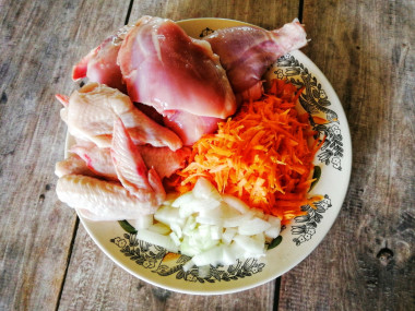 Обычно я покупаю курицу целиком, чтобы использовать разные части тушки для готовки супа или второго. В этот раз отделив ножки и крылья, оставила их, чтобы сделать горячее по давно приглянувшемуся рецепту курица с морковью и луком тушёная.