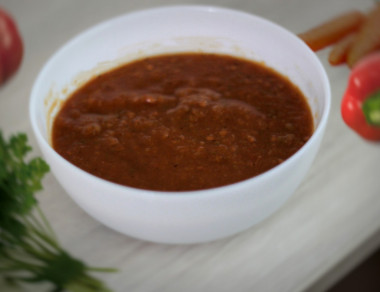 Прекрасная альтернатива магазинным соусам! Оригинальный рецепт для всех любителей соусов и кетчупов. Аджика с морковью и луком отлично подходит под различные виды гарнира и мясо, а также к пельменям! Увеличила количество чеснока, люблю позабористее. Большое спасибо за рецепт!