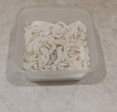 Добавьте в лук муку, закрыв крышкой, снова хорошенько потрясите контейнер.